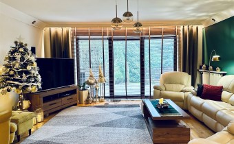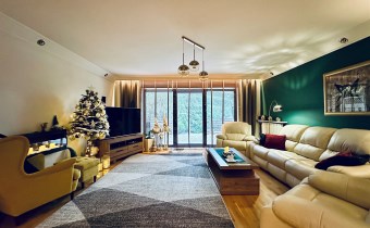 Na zewnątrz znajduje się duży taras, idealny do wypoczynku, oraz ogród obsadzony dojrzałymi drzewami, które zapewniają prywatność, cień i wyjątkowo przytulny klimat przez cały rok.