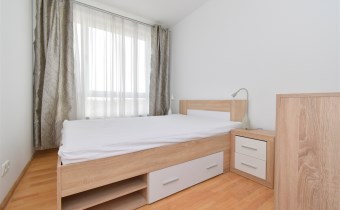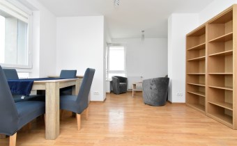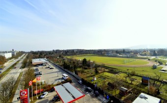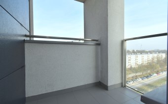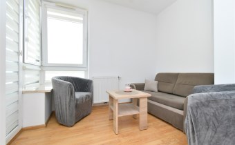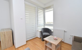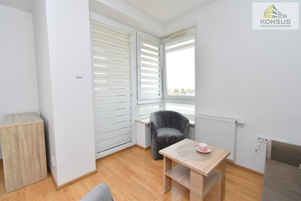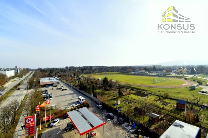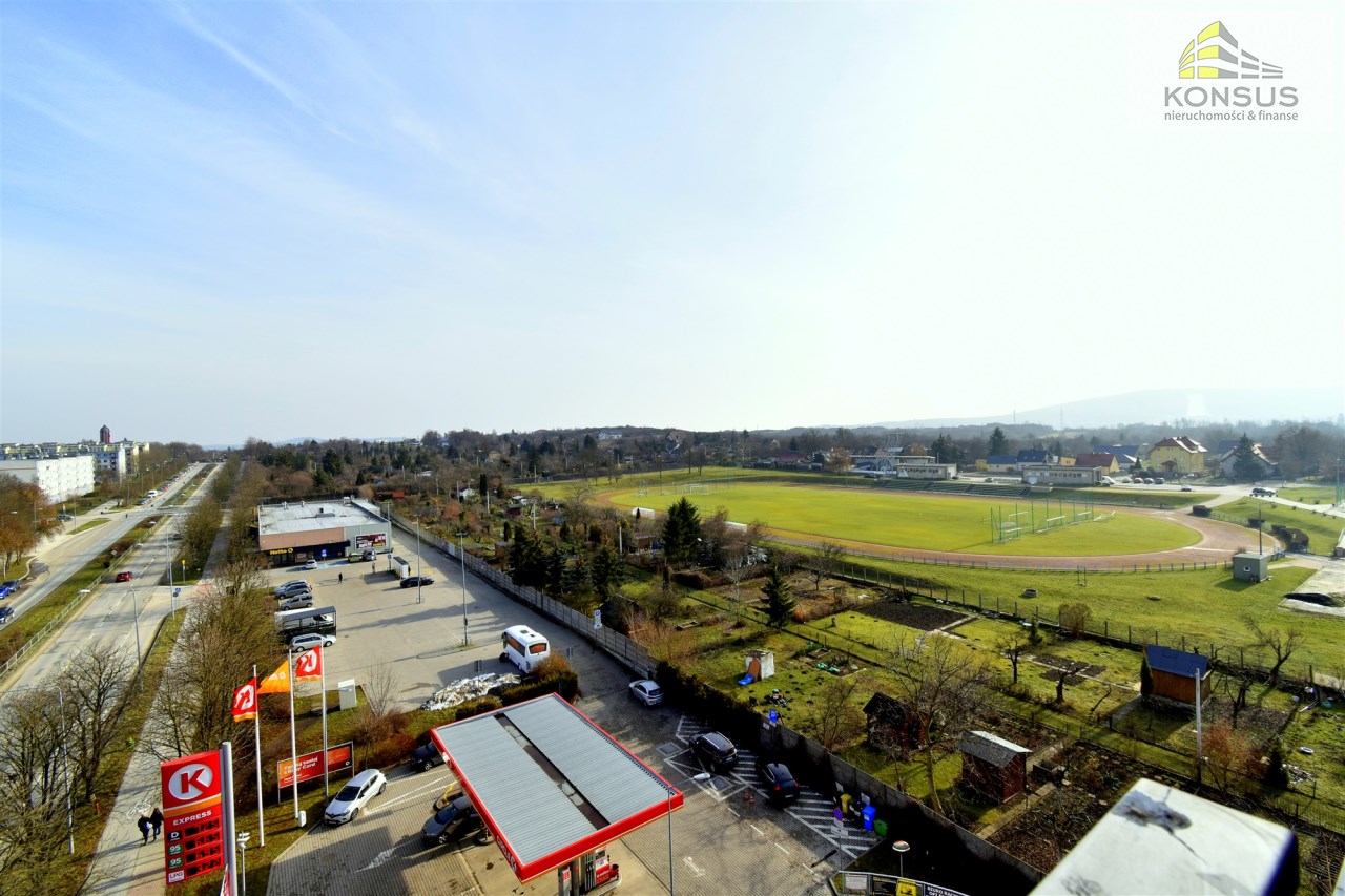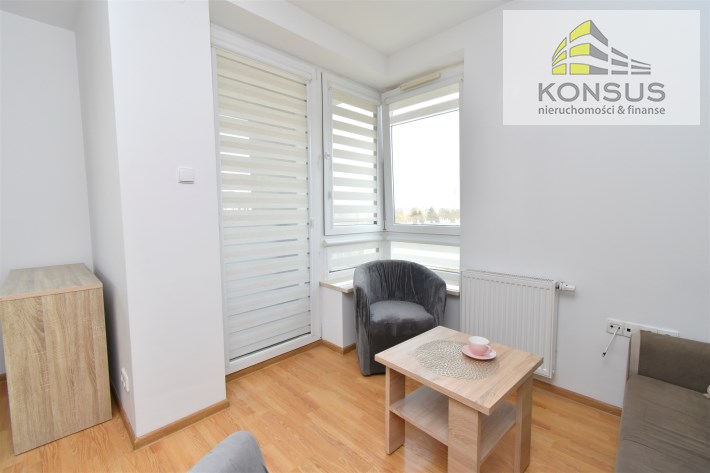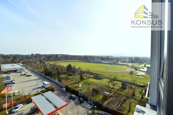 - umeblowanego salonu z wydzieloną częścią jadalnianą oraz wypoczynkową, z wyjściem na balkon, z którego rozpościera się ładny widok na panoramę miasta,